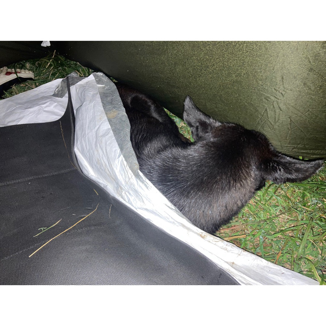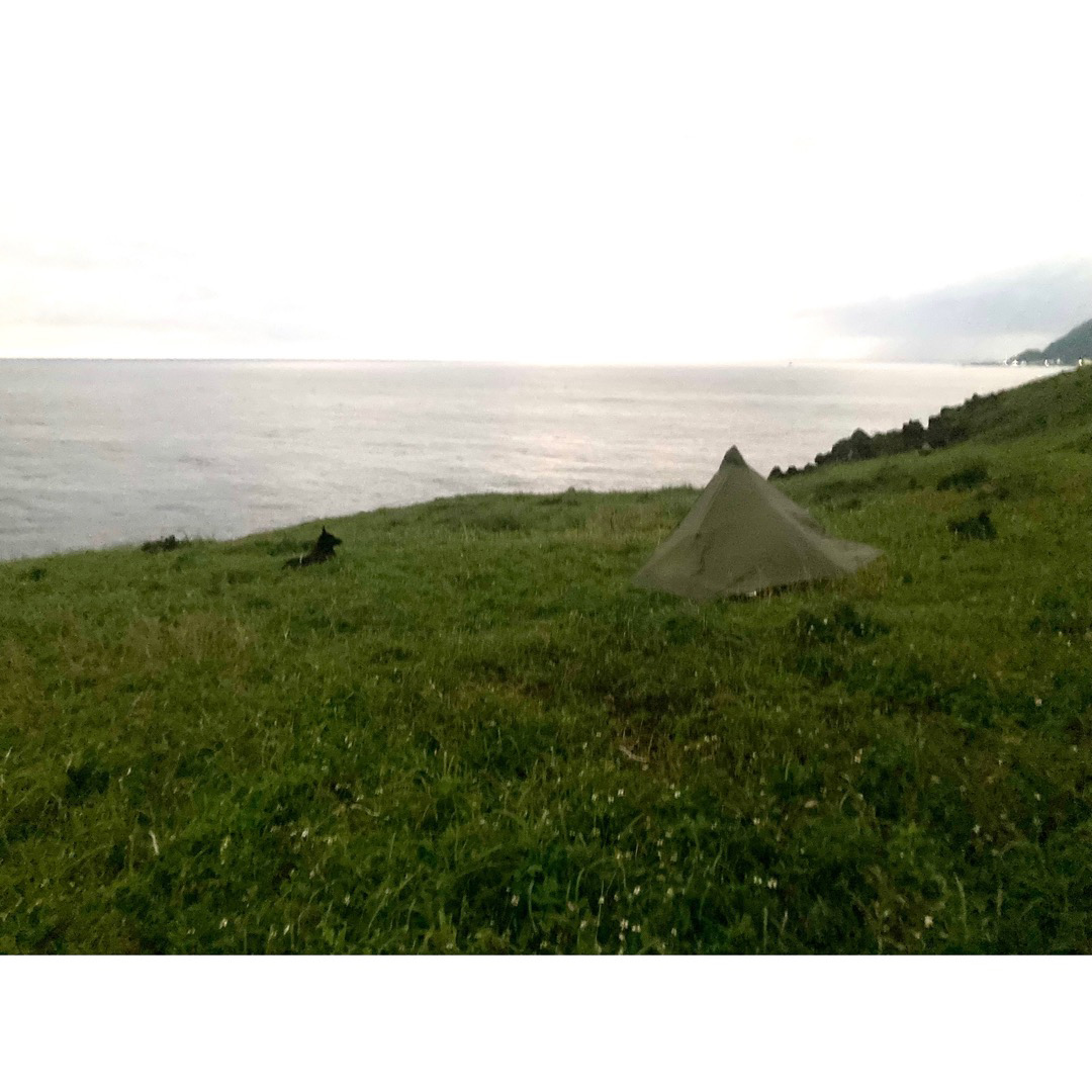 いっとき寝たのだろうか、強い雨音に目を覚ます。止みかけたと思っていた雨が、寝ている間に、また随分と強まったようだ。犬は大丈夫だろうかと心配に思い、目を開ける。すると、黒犬のおしりだけがちょこんとテントの裾から中に突っ込まれている様子を目にする。きっと、この遠慮深い黒犬は、雨宿りしたい気持ちと、テントの中に入ったら申し訳ない気持ちで、こんなお尻の先っぽだけテントに突っ込んだ状態のまま外で雨に耐えているのだろう。テントの裾を上げ、「大丈夫?」と黒犬の顔を覗くと、犬は「あらっ!」という顔をしている。愛おしいものだ。彼女はずぶ濡れで震えている。「入っておいでよ、濡れちゃうよ」と声をかけると、犬はそろそろとテントの中に入ってきて(許可をもらえるまで待っていたんだね、ごめんね…)、乾いた草の上に丸くなり、安心といった感じで、すぐにスヤスヤと寝息が聞こえてきた。そんな彼女の様子に、「雨の中、犬も一緒に寝れて、フロアレスのテントでよかった」と、こころに思う。
