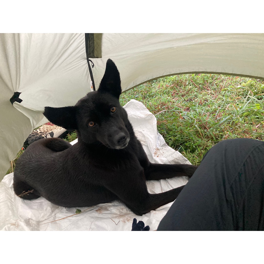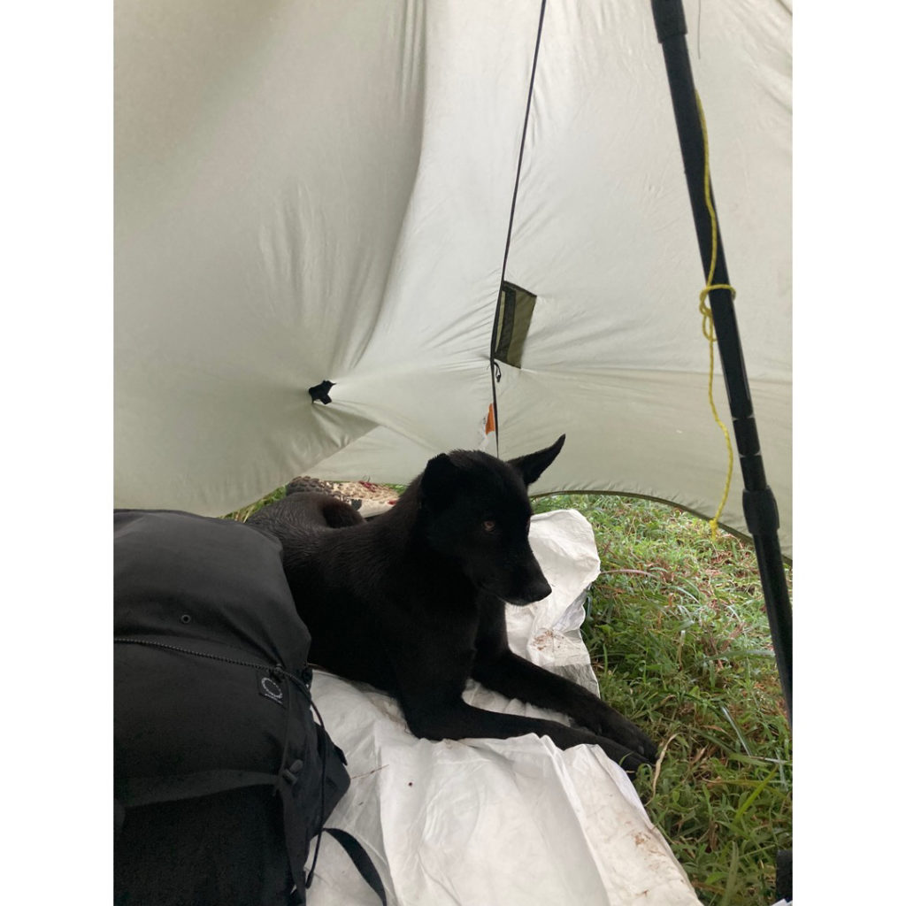 黒犬は、丸くなってまだ寝ている。テント狭いスペースをなんとか工夫して、1時間の瞑想をしよう。雨で壁際にいくと濡れているので、なるべく真ん中へ。ぼくが体勢を立て直そうとガサゴソとしていると、黒犬は「大丈夫かしら?」といった様子で顔をもたげて、こちらの様子を伺っている。彼女が立ち上がろうとする前に、「大丈夫だよ、まだ寝てて」と、手をかけて、撫でて、瞑想す。膝に当たっている、彼女の体が暖かい。