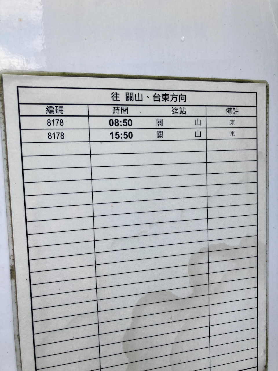 台東は電車の駅が街の中心より少し離れた所にあるので、バスに乗って電車駅まで。バスが着くと、ちょうどGoogleナビに案内されていた電車の出発時刻ギリギリだったので、電光掲示板に表示されているプラットフォームを横目に確認しながらICカードを改札機に通し、走って、走って、電車に駆け込む。無事に乗れたとほっとしたところ、どうやらこの電車は予約席だけの特急列車で、「あ、無断乗車かな、やべぇ」と思ってソワソワして通路に立っていたら車掌さんが来たので、経緯をそのまま正直に話すと、「大丈夫」と言って、追加料金を払って席の番号が記載されたチケットをもらい、これでようやく落ち着いて先に座り込んで、車窓を楽しむ。はあ、よかった。