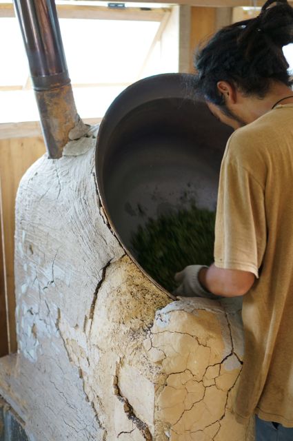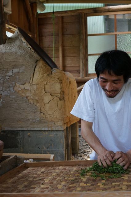番茶はここまでの手順で後は天日に干すそうです。煎茶はこの後、煎り続けるようです。