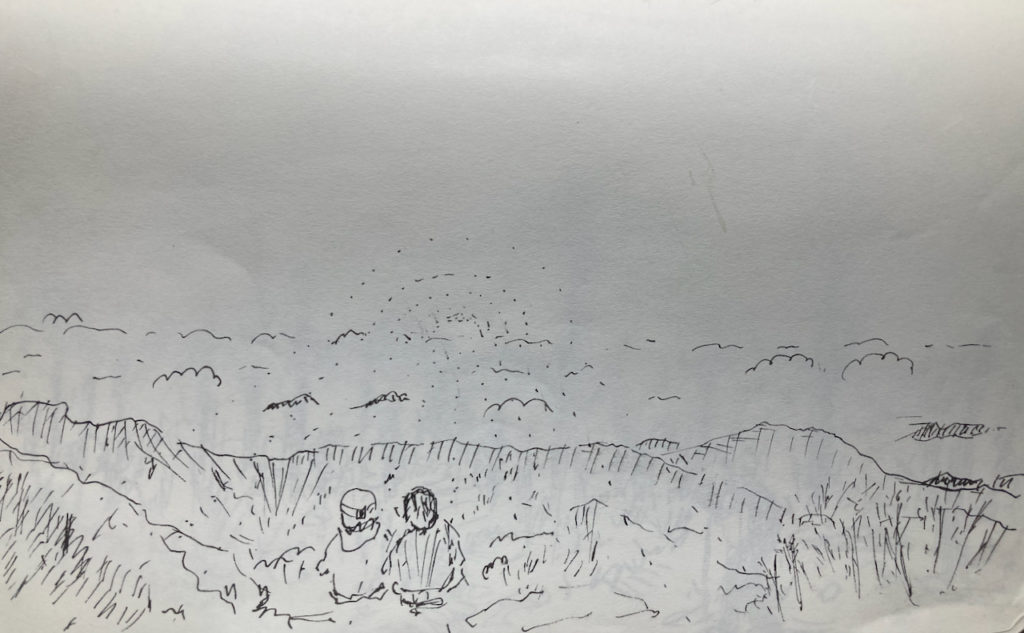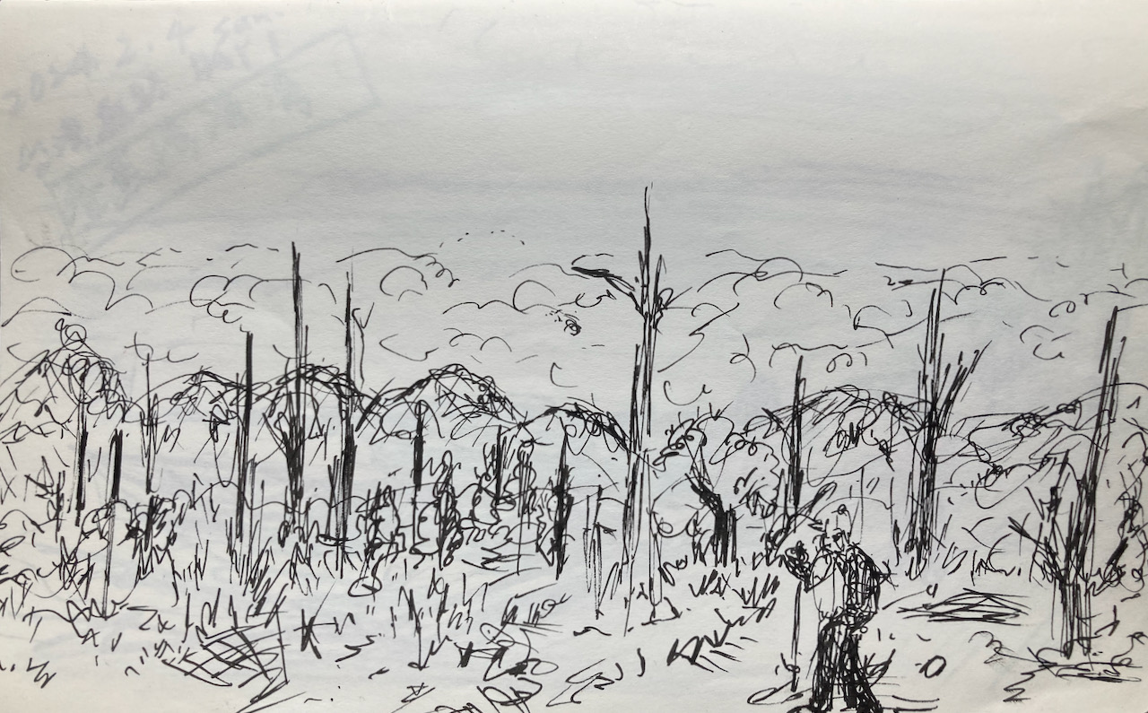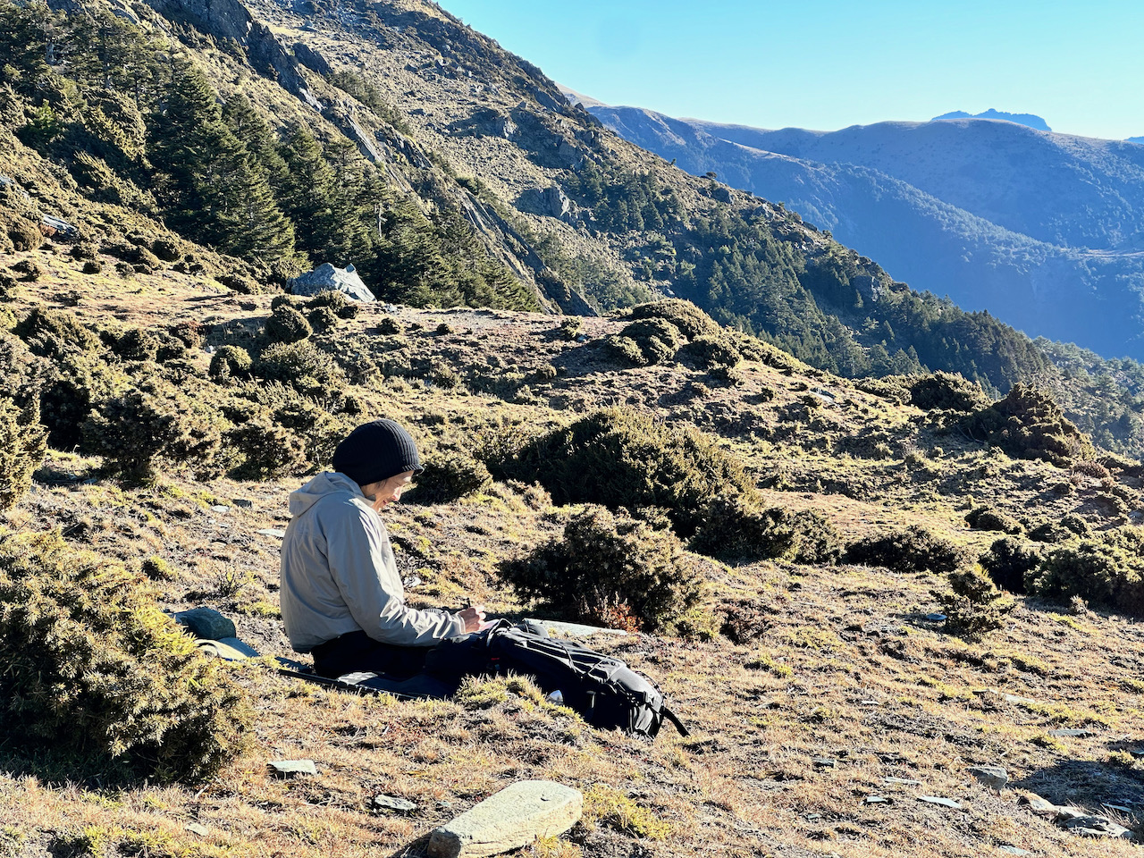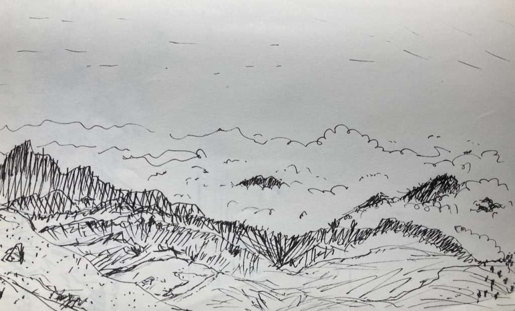 途中、「あ、ここ!」との衝動に駆られる景色に出会い、腰をおろしてスケッチする。「あ、ここ!」と思っても、気持ちが先を急いでしまっていたり、「まあ、また後で」と、なかなかやろうと思ってもやらない自分が常なのだが、この山登りにて、思考で制御するよりも先に、こころが反応したことをパッと行動に移せる自分になってきている。この3日間の山登りでの時間が、自身の内に親和を起こし、ある作用を起こしていっていることを感じる。チャンネルが開いていっている感じがする。