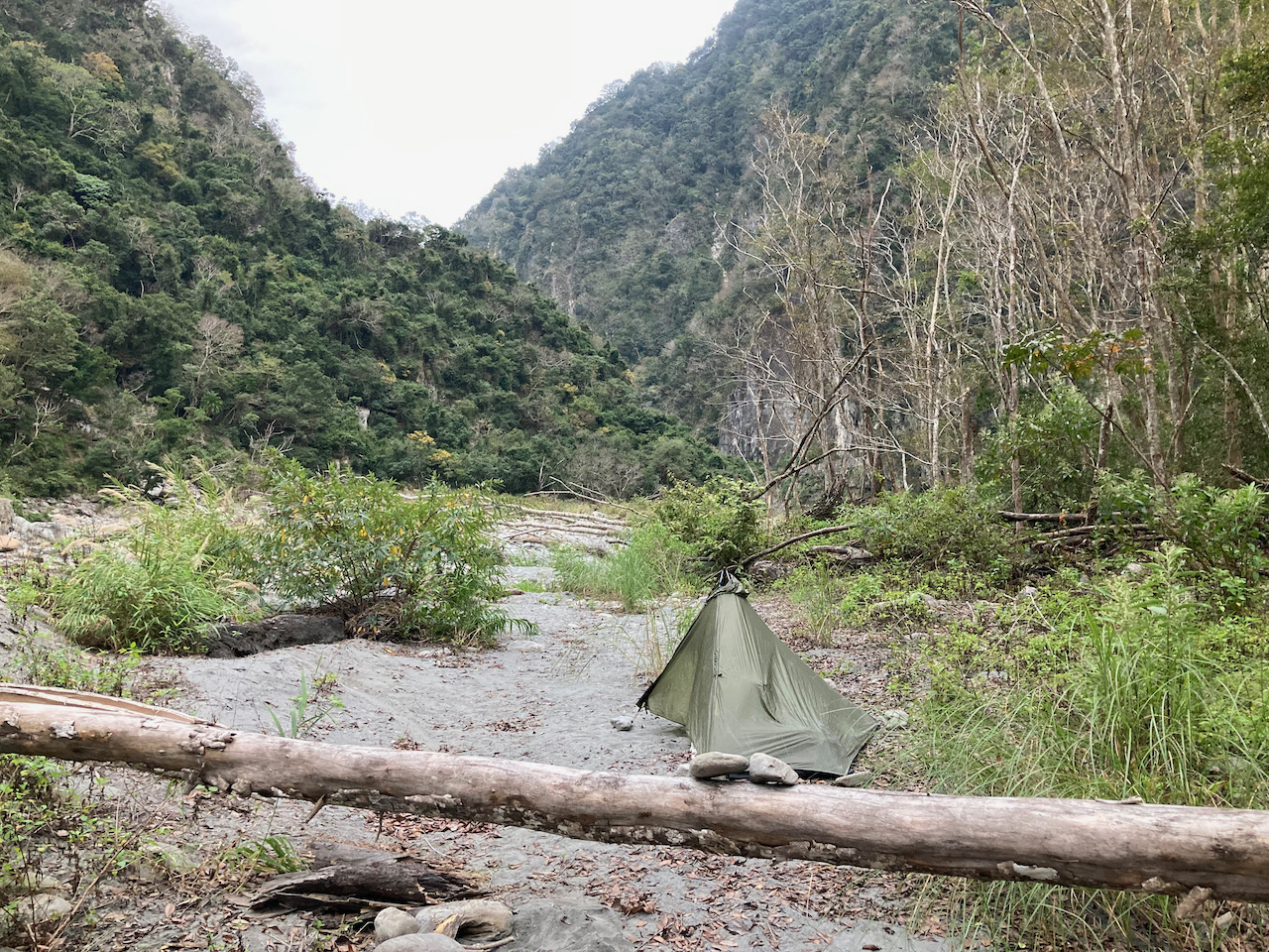 車が走り去っていくのを見届け、河原へ降りる。そして、言われた通りに、温泉を探したけど、どこにも無い、、、。水溜りはあれど、お湯らしきものはどこにもない。「もしかして冷泉のこと」と思いながら匂いも嗅いでみるけどよくわからず、、、。なので、諦めて、テント設営をすることにした。ちょっと、がっかり、、、。