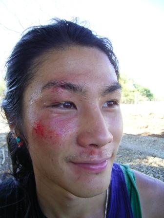 初めての乗馬、初めての馬旅、実際これは、なかなかにしんどいです。ぼくはもう3回も馬から落ちました。一回目は、思いっきり顔から落ちたので、顔に大きな傷ができてしまいました、、、。今思うと、顔面骨折しててもおかしくなかったぐらい…。何回も落ちといてなんでけど、ぼくは落ち方が上手いみたいで、擦り傷だけで今のところすんでいます。落ちたといっても、もちろん自分の技量不足なのだけど、馬がこける場合もあるし、サドルが落ちることもある。自分が直接の原因でないことが多々あります。けれど、馬の上に跨っているときは、その責任を全部自分で負わなければいけません。馬も自分が注意を払っていれば、アクシデントを避けれるのです。けど、まだまだ、今は馬に教わることのほうが沢山です。一回、ぼくが、仲間から外れて道に迷ってしまったとき、どうしよーと思っていたら、馬が勝手に歩き出して、正しい道を選び仲間を見つけてくれました。ぼくのほかにも、他の仲間も結構傷を負っています。馬も同じくに。初めて馬に乗る人たち、初めて人を乗せる馬たちばかりですから。まだまだ、馬もぼくたちもこの旅に慣れていく過程なので、アクシデントが絶えませんね。アクシデントを避けるためには、もっともっと色々なことを知っておかないといけなそうです。今はそれを体で覚えているところ、、。けど、ぼくはあまりに怪我するので、「お前、マゾだろ?」と言われるしまつです…。畜生、傷の分、みんなより早く上手に馬に乗れるようになってやる! あー、傷はもういやだ…。
